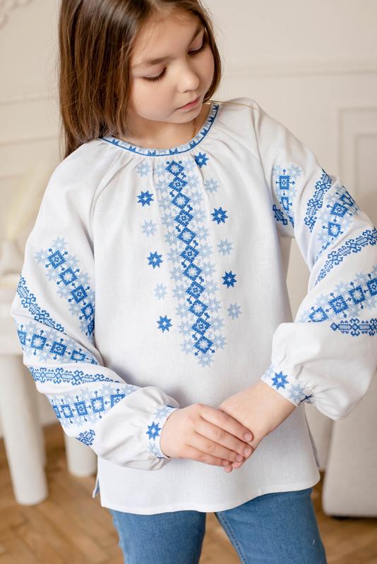 В наличии и под заказ. тливо уточняю наличие необходимого размера или срок выполнения заказа. ❗❗❗ Размеры: 110-170 От 140 р +100 грн От 158 р +200 грн Вышиванка сочетает в себе нежность и глубокий символизм украинской вышивки. Выполнена из натурального полотна, она обеспечивает комфорт и легкость в носке. Орнамент состоит из геометрических узоров, расположенных вдоль груди и рукавов, которые символизируют гармонию и защиту. Свободный крой и сборки у горловины добавляют удобства и стиля, а рукава на манжетах создают элегантный силуэт. Тканина бавовна 100% Тип вышивки хрестик