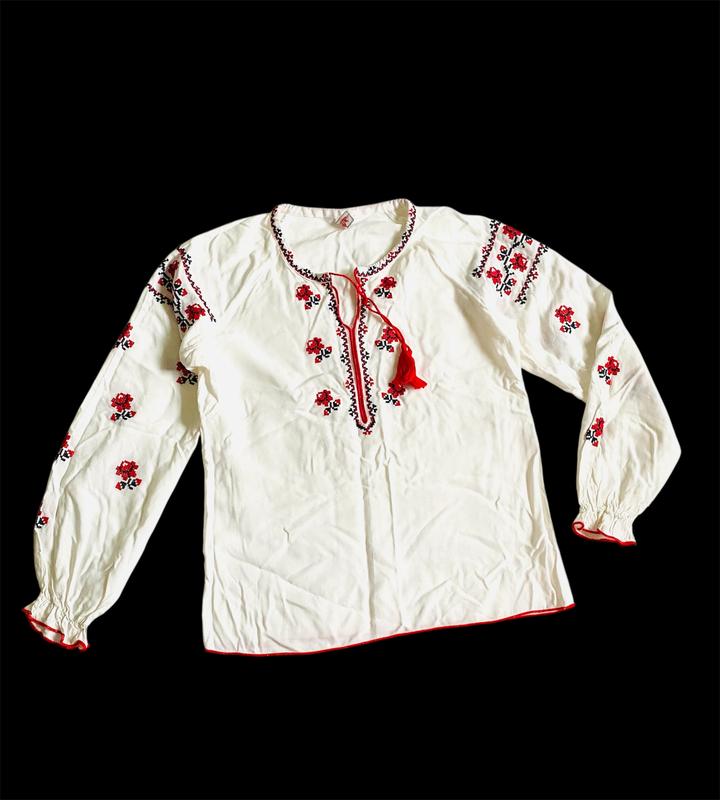 Блуза вишиванка з рукавом реглан, ворот на шнурку утягується, рукава манжети на резинці , тканина натуральна типу віскози, але бірочки немає🤷♀️ Заміри: пог 40, довжина 52, рукав від ворота 57
