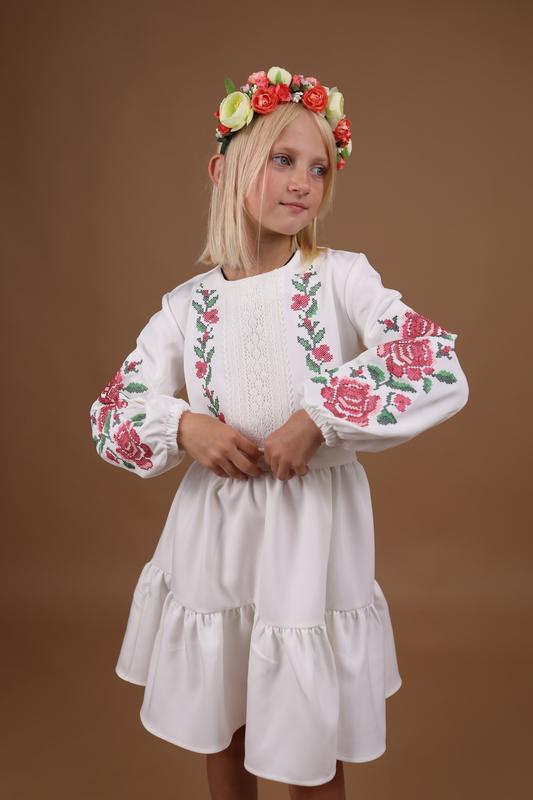 Розмірний ряд: 110-152 Ціна 1100 грн: розміри 110-128 Ціна 1200 грн: розміри 134-152 Святкова, сучасна сукня вишиванка для дівчинки. Оздоблена мережкою та вишитим квітковим орнаментом. Виготовлена на основі тканини Барбі. Тканина має легкий блиск, який надає їй елегантності, і добре зберігає свою форму.