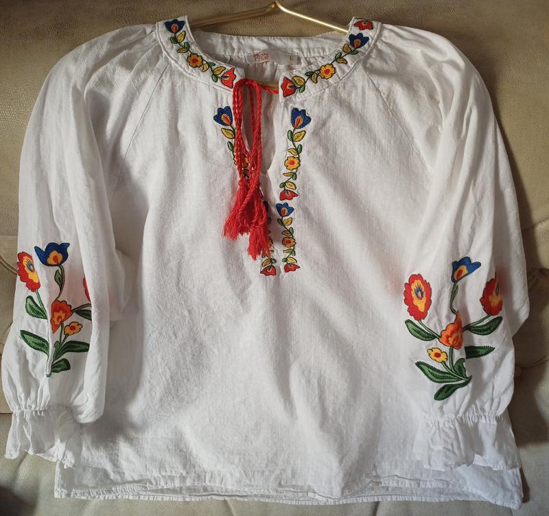 В ідеальному стані вишиванка для дівчини. Розмір зазначений L, на мій погляд підійде на S-M. Тканина не тягнеться, 100 % коттон. НОГ 50 см НОС 57 см довжина 59 см Рукав від шиї 54 см