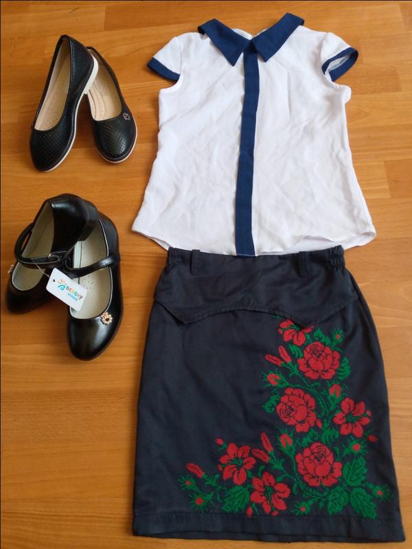 Комплект (з 1 і 2 фото) все за 600 грн. Якщо окремо,ціни нижче) Без дефектів,стан гарний. Додаткові фото за потреби надам. 122-128 см.для дівчинки, 1 клас. Туфлі всі нові. 1)Шкільні 33 розмір,устілка 20 см. 200 грн. 2)Балетки(можна як змінну взуванку) 31 розмір, 19,5 см. (Всередині!), 150 грн. 3) Спідничка вишиванка 200 грн.Темносинього кольору. По бокам резиночки в поясі. 4) Блузка біла с темно-синіми вставками. 120 грн. 5) Спідничка з сіточкою темно-синя 128 см., 200 грн.