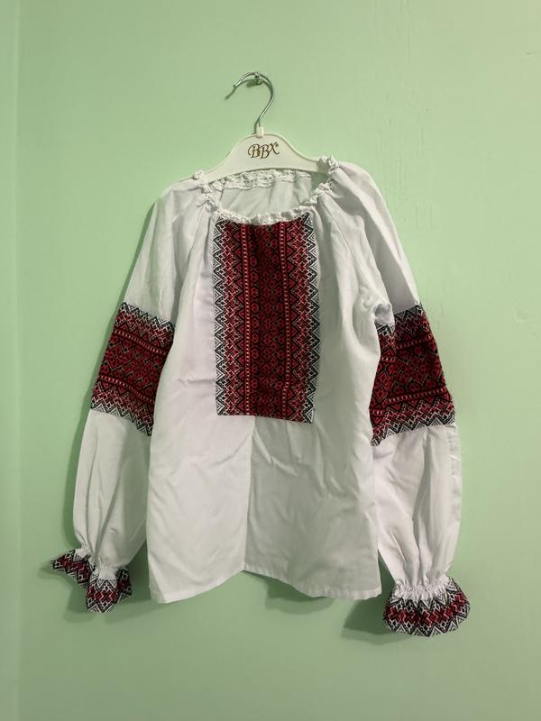 Вишиванка в ідеальному стані, жодного дефекту. На манжетах та горловині резиника. Підійде для розміру 116-122. Заміри: рукав від горловини 49 см, довжина вишиванки 46 см, пів обхват грудей 35 см