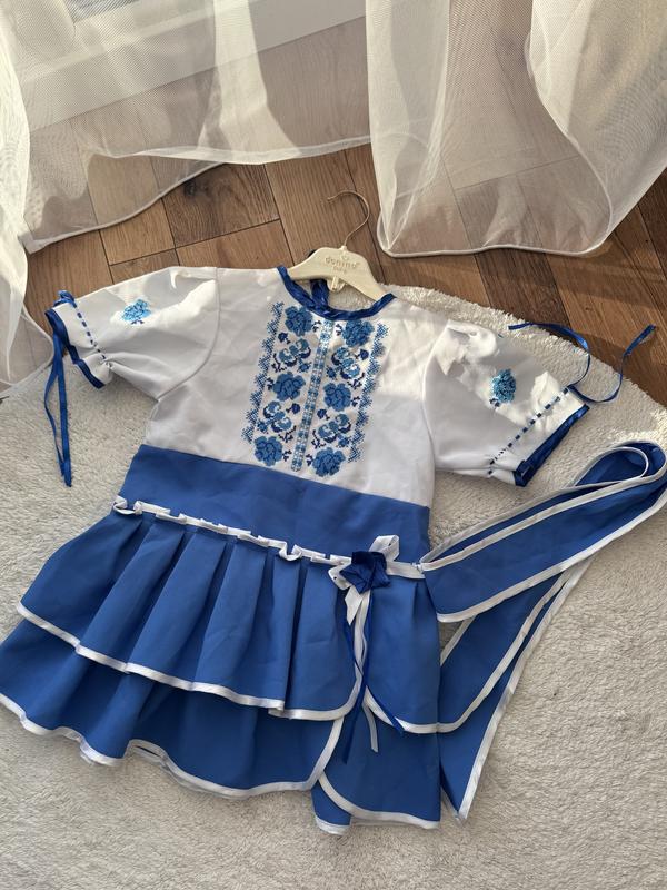 Сукня з вишивкою для дівчинки в нова!! З поясом і рукавчики стягуються на будь-який обʼєм. На дівчинку від 2-4 р. Довжина - 52 см Ширина в плечах - 25,5 см