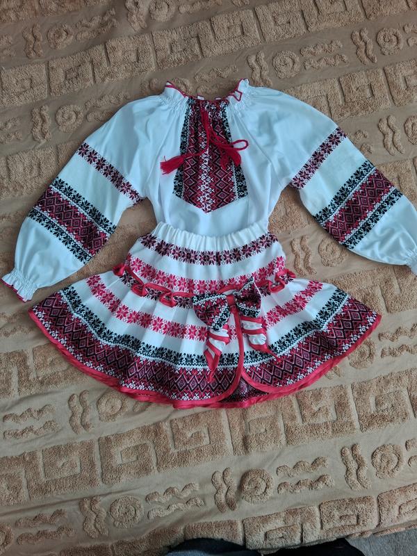 Стан ідеальний.Одівали тільки на свята.Підійде від 3-5років.Верх довжина 39см.ширина 32см.Рукав від горловини 40см.Юбка довжина 25см.Ризинка 20см тяниться
