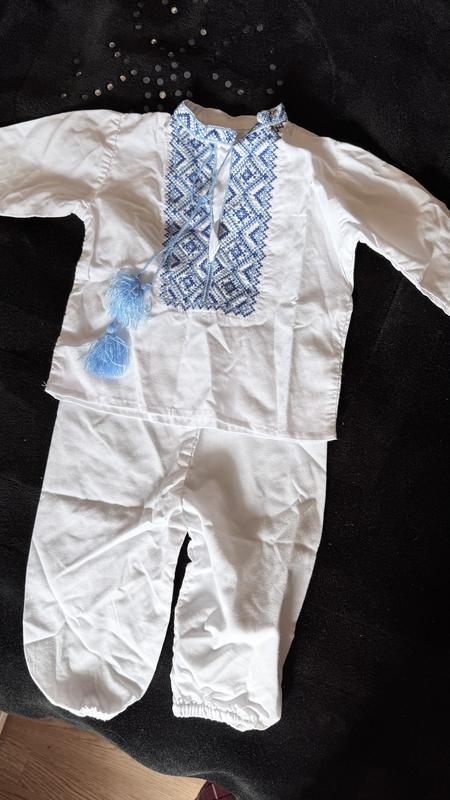 Дитячий комплект вишиванки: біла сорочка з синьою традиційною вишивкою та китицями, у комплекті білі штанці на резинці. Легкий, зручний та святковий варіант.