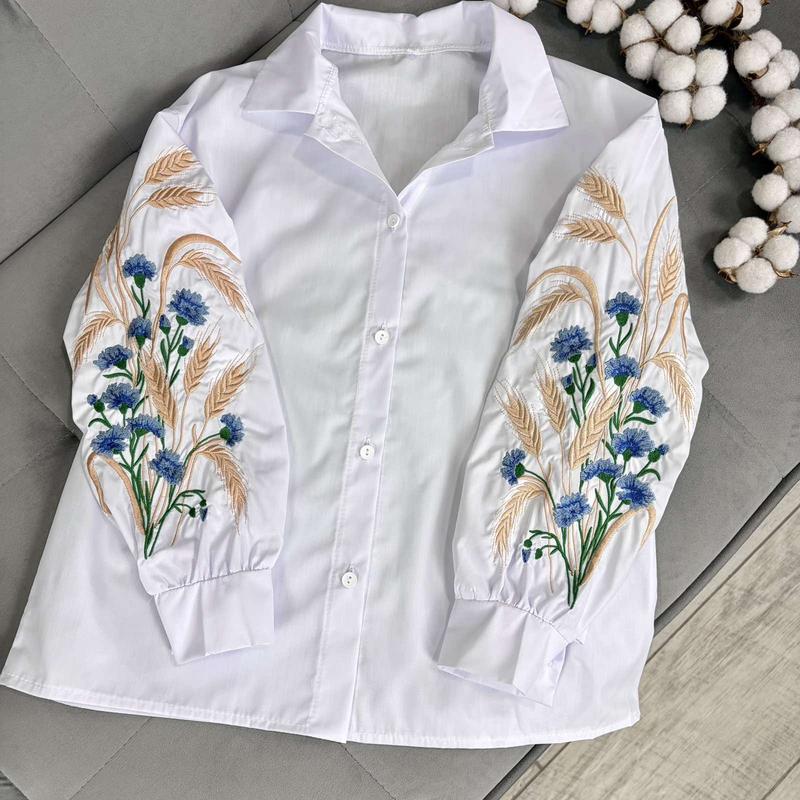 Вишиванка для дівчинки Пшениця/Волошки на ґудзиках. Машинна вишивка, дуже гарна та якісна. Тканина котон-поплін. Манжети на ґудзику. 📐Заміри: рукав від коміру 146 - довж. 56 / напівобхват 49 /рук.59 152 - довж. 59 / напівобхват 51 /рук.63 158 - довж. 63 / напівобхват 52 /рук.67 164 - довж. 64 / напівобхват 54 /рук.71