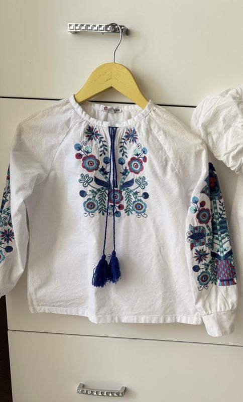 Дуже гарна вишиванка, 100% котон, машинна вишивка. Стан ідеал. Довжина 45, нОГ 40, рукав від горловини 50. Буде на 5-6 років