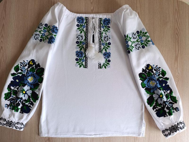 Вышиванка из натурального льна. Машинная вышивка. В идеальном состоянии. Одетая пару раз. Горловина затягивается, рукава на пуговице. Замеры рукава от горловины 48 см, полуобъем груди 36 см, длина по спинке 44 см.
