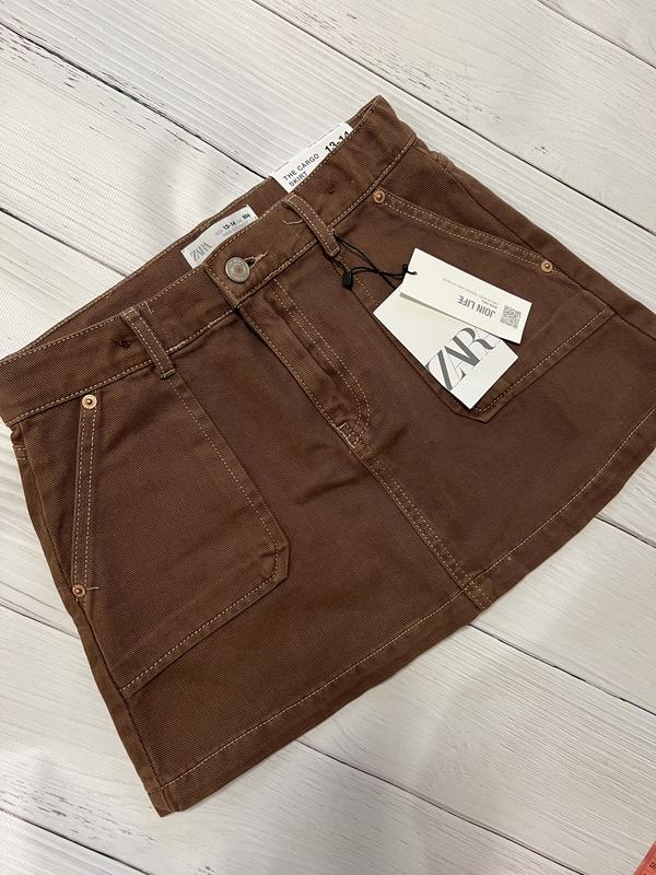В наявності джинсова спідниця Zara.По бірці розмір 13-14р(164см),але реально на 146-152см.На талії є утяжечки.Довжина по бічному шву 32см,пот 34см(можна зменшити),поб 44см,ширина по низу 50см.