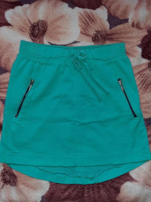 Спідниця для дівчинки, розмір 9/10 років. довжина спереду - 31,5 см довжина позаду - 37 см довжина сбоку 31 см п/о талії - 27 см тягнеться до 35 см п/о бедер - 36 см є дві плямки вони не дуже помітні