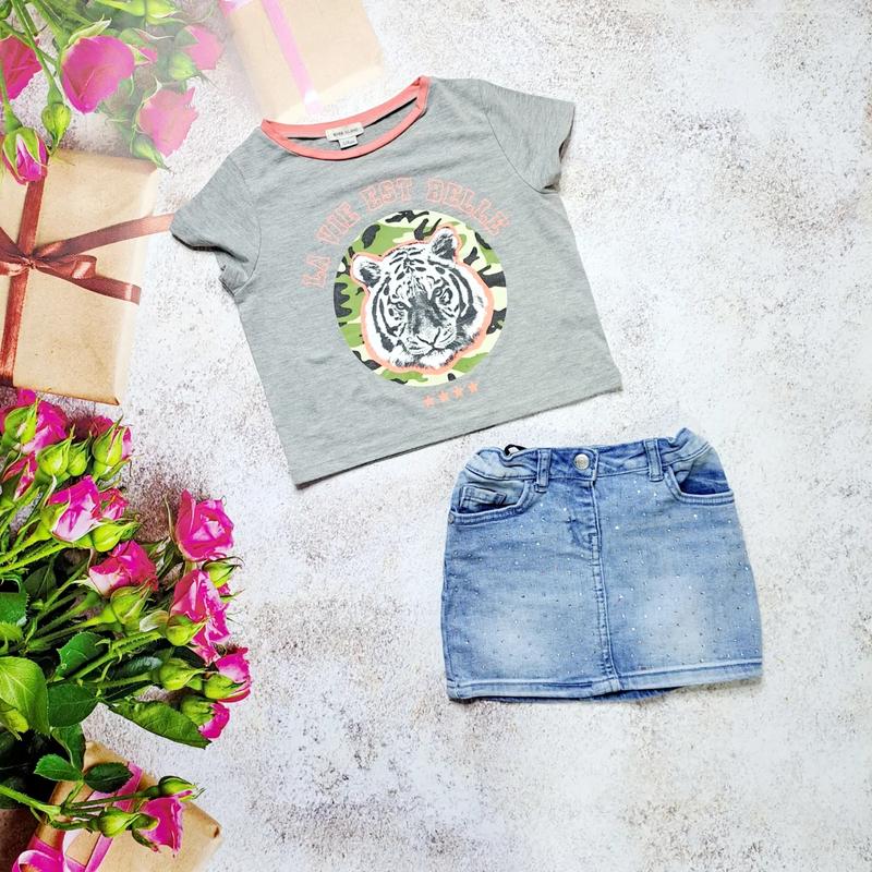 Укороченная футболочка с тигром от River Island на 3-4 года Состояние идеал Шир 35 Длж 35 Цена 90 грн Джинсовая юбка с стразами на 3-4 года. В идеале Шир 27 (есть утяжка ) Длж 24 Цена 120 грн
