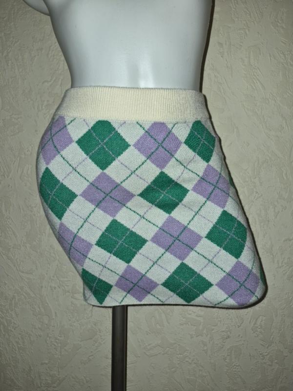 Теплая юбочка, облегающая в зеленый и сиреневый ромб. Подойдет на рост 130-140см. Тянется в бедрах до 40см полуобъем