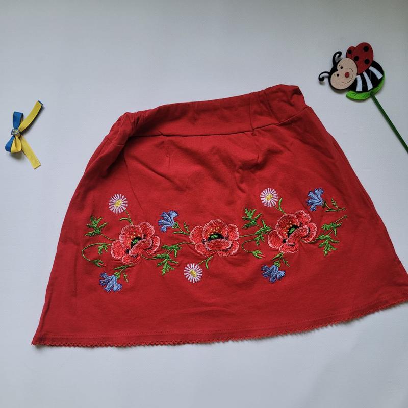Дитяча спідничка, з вишивкою квіти, прикрашена краю ажурним рядком. Розмір (110-116 см) заміри: ширина по резинці 24 см, довжина 31 см.