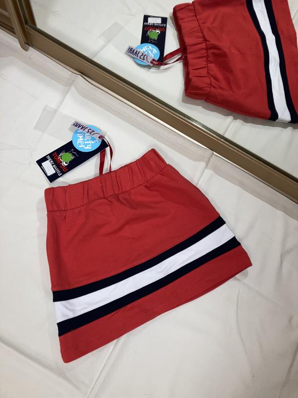 Спідниця трикотажна катонова в спортивному стилі, дуже круто виглядає під кросівки. Виробник Туреччина. Розмір 116-122 см- довжина 28 см, в поясі 24 см