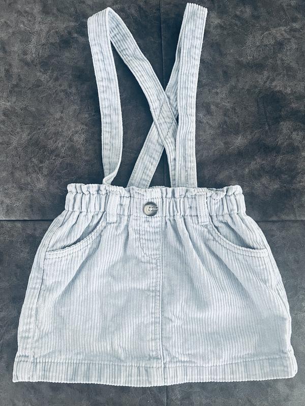Юбка в идеальном состоянии (как новая) одета несколько раз. По набору 86-92 но болеемерит носили до роста 100 см. Длина и ширина самой союзные 22 см. Пояс на резинке тянется. Что очень удобно бретели отстегиваются. Длина с бретелями 42 см, возможно сделать меньше на 5 см. Вельветовая, цвет нежно голубой