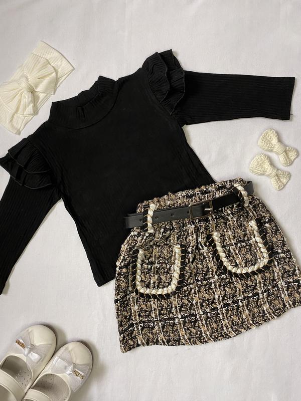 Образ для девочки🖤 Черная кофтина с рюшами на плечах. Твитовая юбка с кармашками Качественный ремешок Мега крутой и стильный look ❤️🔥 Размеры: ◻️120 Цена 🏷️599uah Для заказа/консультации пишите в дырект