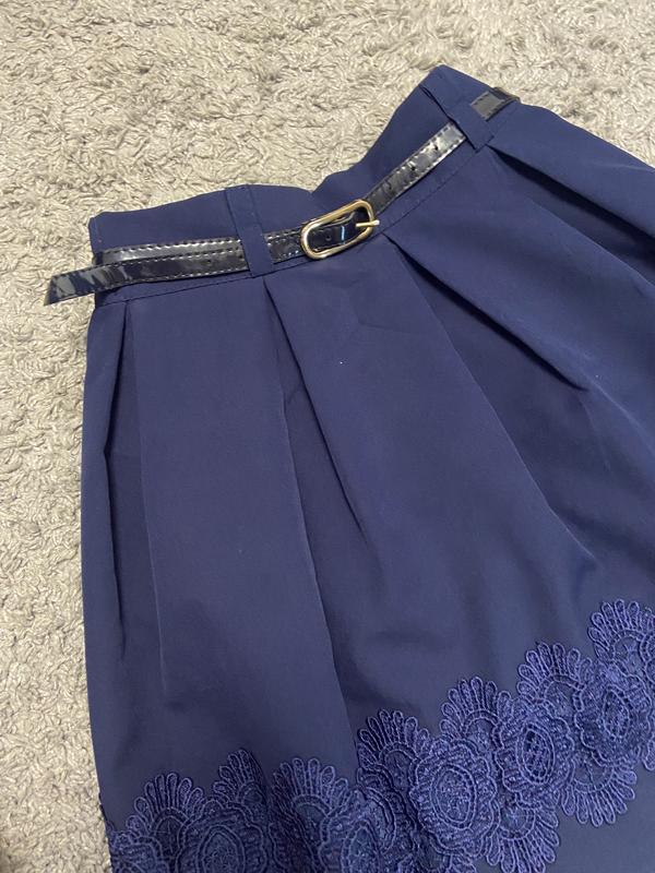 Юбка для школы девочке темно-синего цвета, с узорами внизу, с ремешком, также на поясе с обеих сторон есть резинка, подойдет где-то на 140