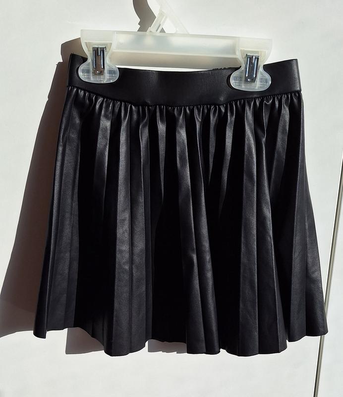 Трендова спідниця плісе з еко шкіри. Матеріал дуже легкий! По біці 7 років ріст 122 Довжина 33. Стан ідеальний