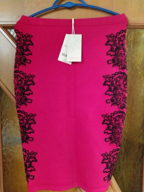 оригинальная стрейчевая юбка-футляр с вышитым цветочным принтом по бокам. Длина-61см, бедра-84см, талия-72см, основная составляющая-вискоза+эластан, размер 38, цвет-Berry