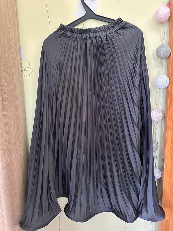 Спідниця сіра , атлас, в складку. Кльошна. Знизу форму надає ліска. Стильна , дизайнерська . Довжина 88 По талії по резинці 33 В розтягнутому максимально вигляді - 50 Бедра оверсайз