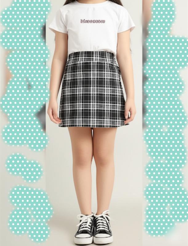 Спідниця для дівчинки, має класичний та універсальний дизайн у чорно-білу клітинку (тартан або шотландку). Візерунок складається з пересічних горизонтальних і вертикальних ліній білого кольору на чорному тлі, створюючи діагональний або ромбоподібний ефект. Клітинки досить дрібні й щільні. Загалом, це стильний і позачасовий елемент гардеробу, який може бути адаптований для різних образів – від повсякденних до більш офіційних, залежно від комбінацій з іншим одягом та аксесуарами.