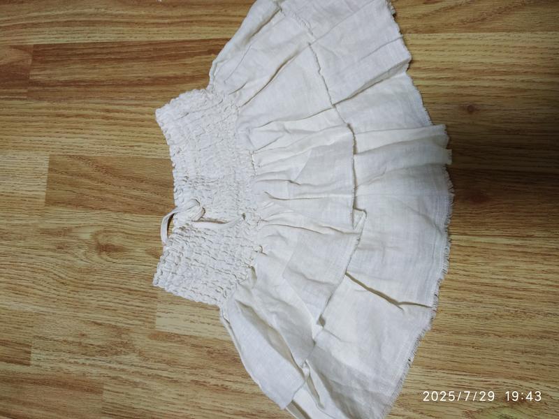 Спідничка- шорти, на дівчинку 8-9 років. Пояс широкий, на м'якесеньких тоненьких резиночках. Стан ідеальний, тканина, натуральна, у складі-льон, колір - трохи бежевий. Шортики зроблені з тканини типу батисту, тоненькі, приємні дуже))). Зручніше не знайдете))). Довжина спіднички, разом з поясом- резинкою- 28,5 см, напівобхват талії (резинка в спокійному стані- 24.5 см. Не виглядає закороткою. просто дещо прикриває шортики. Дуже гарно виглядає.