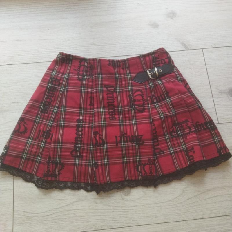 Коротка спідниця у шотландську клітинку для дівчинки (орієнтуйтесь по замірах). Колір червоний з чорними та білими смужками. Декор чорні написи та візерунки. Маленький ремінець із пряжкою збоку, по низу оздоблена чорним мереживом. Фасон зі складками, зручно сідає на талії. Ідеально підійде для створення стильного образу у школі чи на прогулянку. Талія 28 см, довжина 30 см (з рюшечкою).