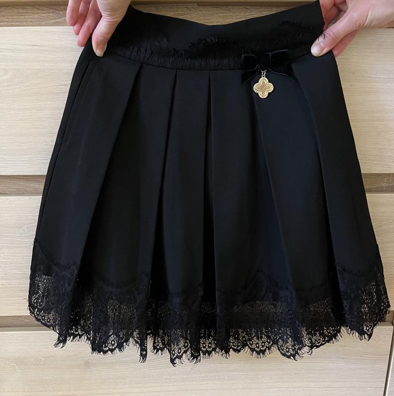 Чорна спідниця з мереживом ✨ Стан: ідеальний, б/у. • Стильна чорна спідниця з ніжними складками та мереживною обробкою по низу. • Прикрашена бантиком і підвіскою, виглядає елегантно та жіночно. • Є зручні кишені (не затерті). • Ідеально підійде як для школи, так і для святкових виходів. 📏 Розмір: 128, 8-9 років. ⚫ Колір: чорний