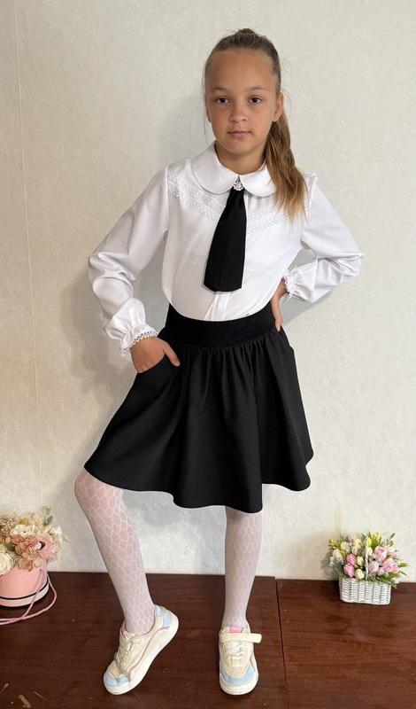Спідничка з карманами . Мод 561 Тканина мадона. Колір : Чорний І синій Розміри: 122, 128, 134, 140, 146, 152 зріст