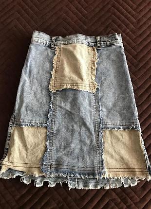 Джинсова спідничка з лоскутків для дівчинки з заду закльобка і замочок, стрейчева. Довжина виробу 41 см. Півобхват талії 26 см.