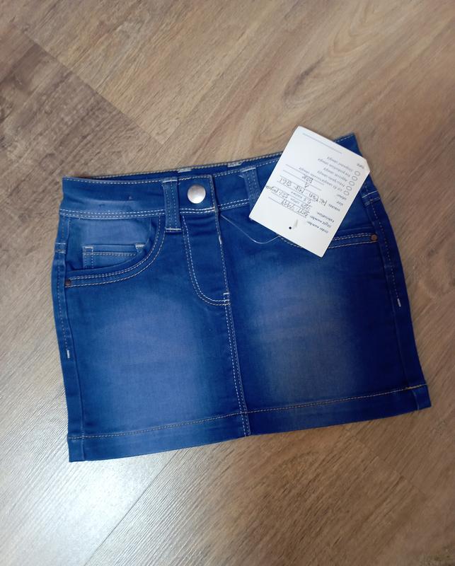 стильна джинсова стречева спідничка на дівчинку в розмірі 98- 104 на 3-4 рочки всередині є резиночки для фіксації талії має дві бокові кишеньки і дві кишеньки позаду. Довжина 25 см талія по резиночці 28 см бедра 31 см
