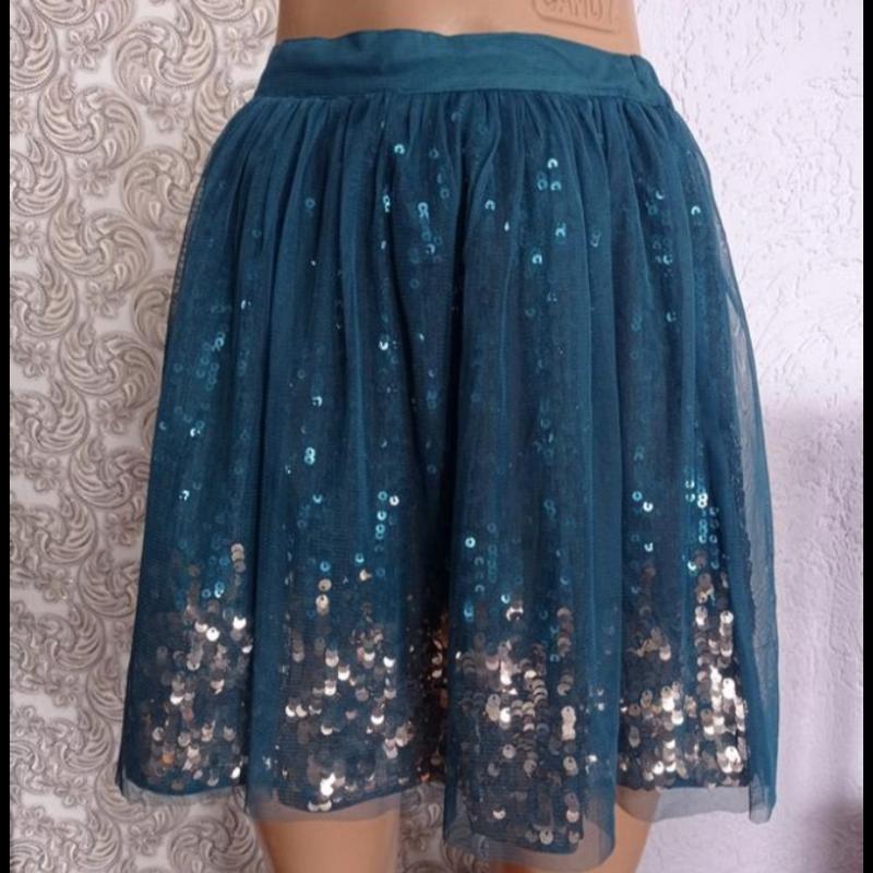 Ошатна спідниця на дівчинку темно-зеленого кольору.На підкладці.На талії гумка. Склад: 100% поліестер. Стан новий, місткість бирки. На 9 років.На зріст 134 см. Заміри: ПОТ-28 см (гумка); довжина — 42 см. Фото на дитині немає. Пересилання.