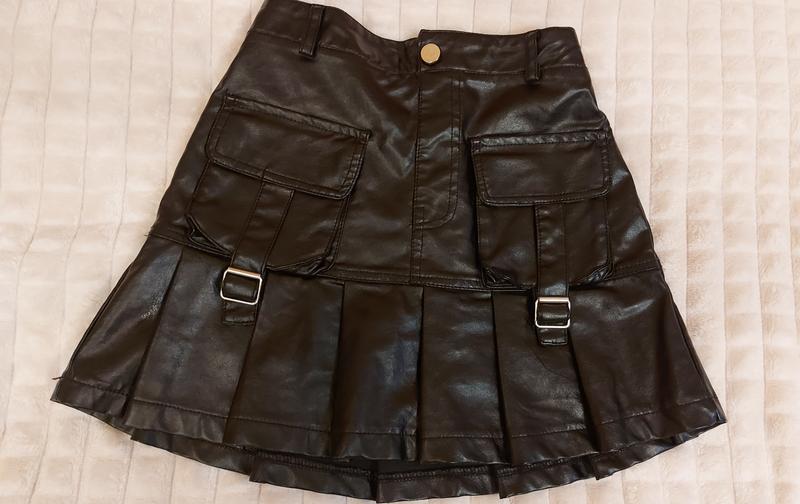 Стильна спідниця з глянцевої екошкіри на 7-10 років. Пояс на резинці, перед має накладні кишені, є підклада. Пояс 29, легко тягнеться, стегна 40, довжина 35. В ідеальному стані, як нова.