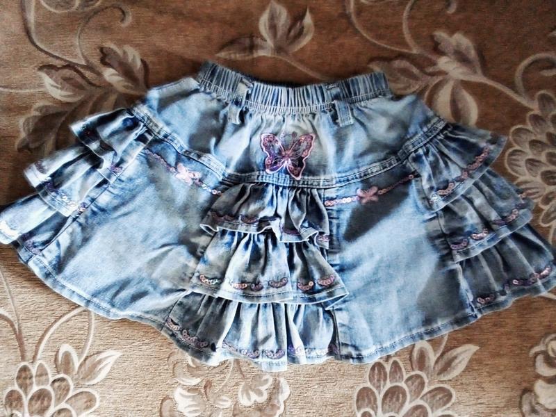 Джинсова спідничка з паєтками для дівчинки, довжина 29 см, пояс на резинці.