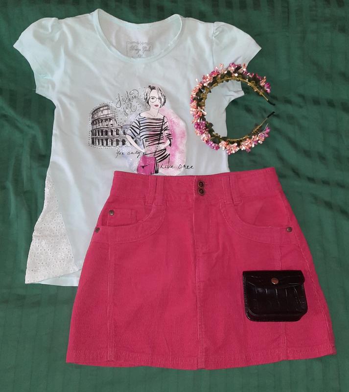Малинова Спідниця, тканина - мілкий вільвет, в поясі є гумові утяжки, спереді та ззаду по два кишені, застібається на блискавку та гудзики, зріст 134-140 см, нова.