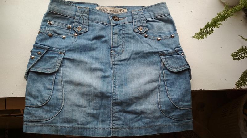 Мини-юбка джинсовая светло-синяя с заклепками Приблизительно на 9-11 лет(указан вроде 25 размер), но лучше ориентироваться по замерам ПОбхТ-33см, ПОбхБ-39см, Длина -34,5см(по боковому шву).
