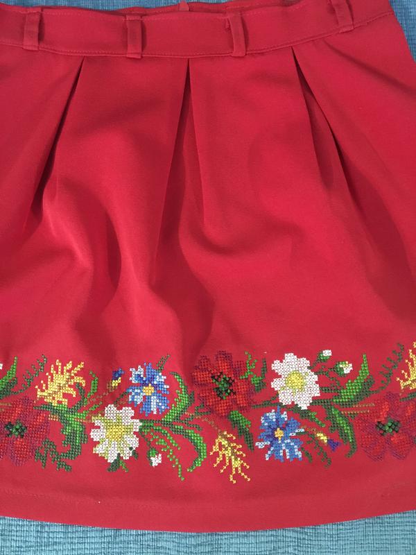 Спідничка вишита на костюмній тканині , застібається ззаду на блискавку , розміри на фото , машинна , вишивка