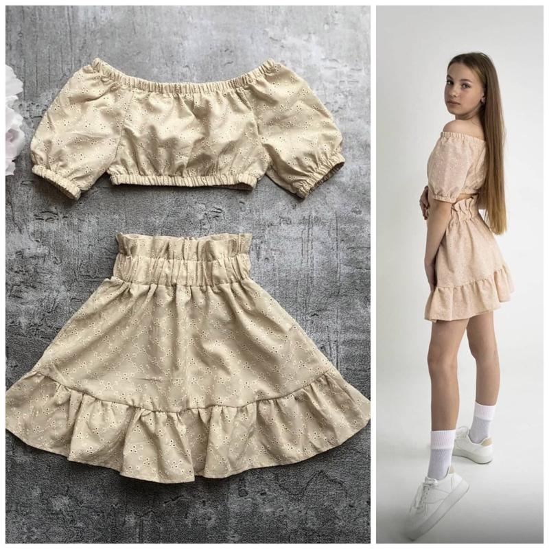 Цена 460грн Стильный костюм Топ и юбочка. Легкая натуральная ткань- прошва. Модная новинка этого сезона. Качество шикарное ❤ Топ: Размер-длина/ширина 128-18/25 134-18/27 140-18/29 146-20/30 152-21/30 Юбка: Размер-длина/пояс 128-35/22 134-35/24 140-37/25 146-38/26 152-39/28