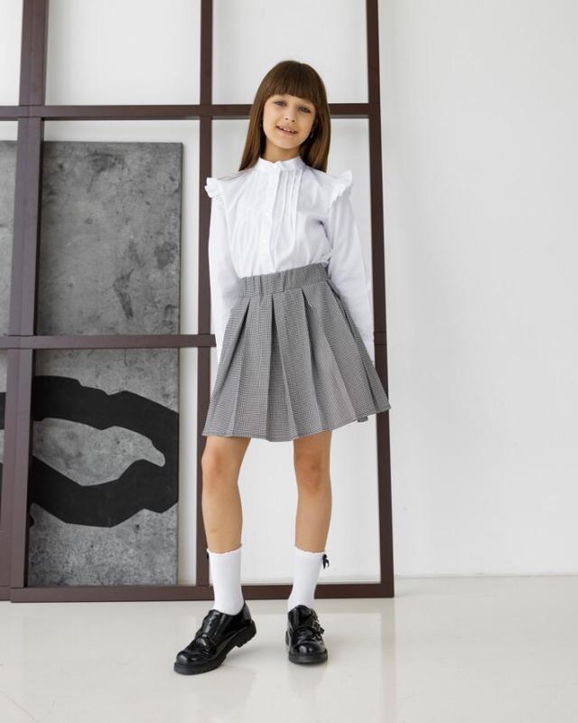 Очень стильная, красивая, удобная школьная юбка для девочки. Идеально подойдёт под блузу, гольфик или любую кофточку. Стильно смотрится под кеды или слипоны. Расцветка-гусиная лапка, по бокам кармашки. Доступны размеры 122, 128. 134, 140. Полномерные.
