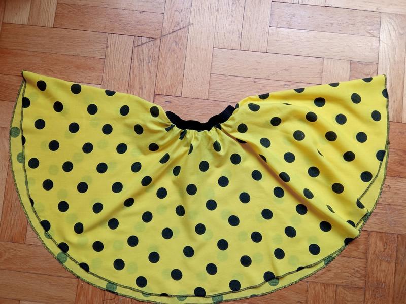 спідничка жовта в чорний горошок сонцекльош на резинці. Заміри: ПОТ 22 см, довжина 38 см.