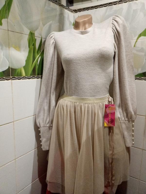 Має сліди примірки, зрізана з середини етикетка. Має етикетку бумажну, і якісь дві шлєйки пришиті. Має брак, останнє фото. Таке в 4 - х містах по нижньому шару сітки. Має з під низу обтягуючу юбку.
