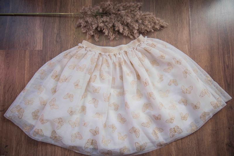 Легка спідничка бежевого кольору з золотистими метеликами на 9-10 років. Стан ідеальний, одягли 2 рази. за вимірами пишіть-відповім.