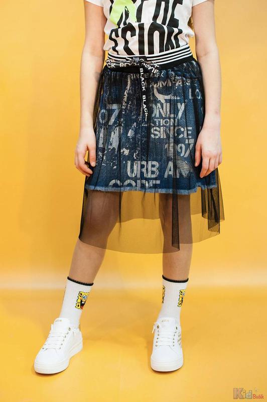 Стильна спідниця для сміливих дівчат, які не бояться експериментів зі своїм одягом. Чорний прозорий фатин і джинсовий низ роблять цю модель дуже крутий і ефектною. У даній моделі Ваша дівчинка буде виглядати оригінально.
