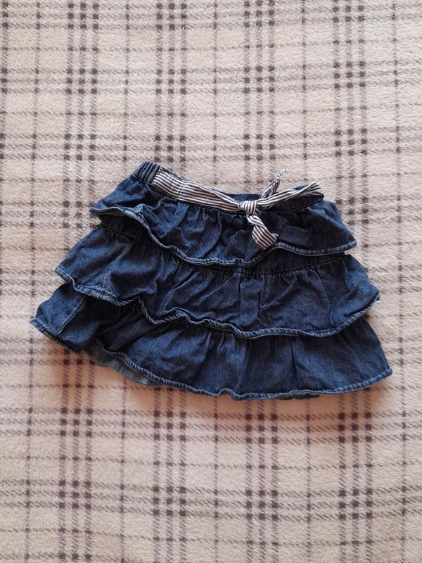 Джинсова дитяча спідниця на резинці з рюшами, спереду є пояс (декор). Півобхват талії 22 см, довжина 22 див.