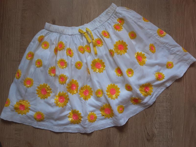 лекая юбочка на хлопковой подкладке,расшита подсолнухами из пайеток,талия резинка и шнурок ,пот 31-46 см,длина 38см