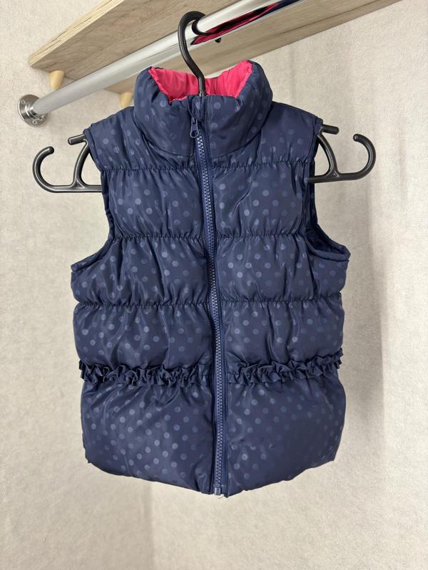Жилетка на дівчинку у ідеальному стані. Вдягалася декілька разів. На вік 5-6 років, зріст 116 см. Довжина - 43 см, ширина - 38 см.