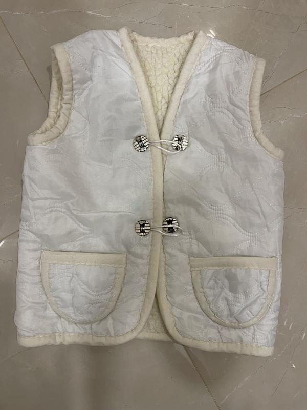 Тепленька, в дуже хорошому стані, лише потерлася фарба на ґудзиках. Груди - 44, довжина - 50