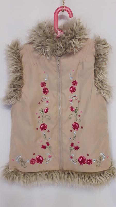 Ширина плечей-30 +по 4см хутряна обробка, груди ЗА-42, низ ЗА-44, довжина-54. Жилетка йде з синтепоновим прошарком. Вік 9-10 років, зріст 140. Дефектів немає.