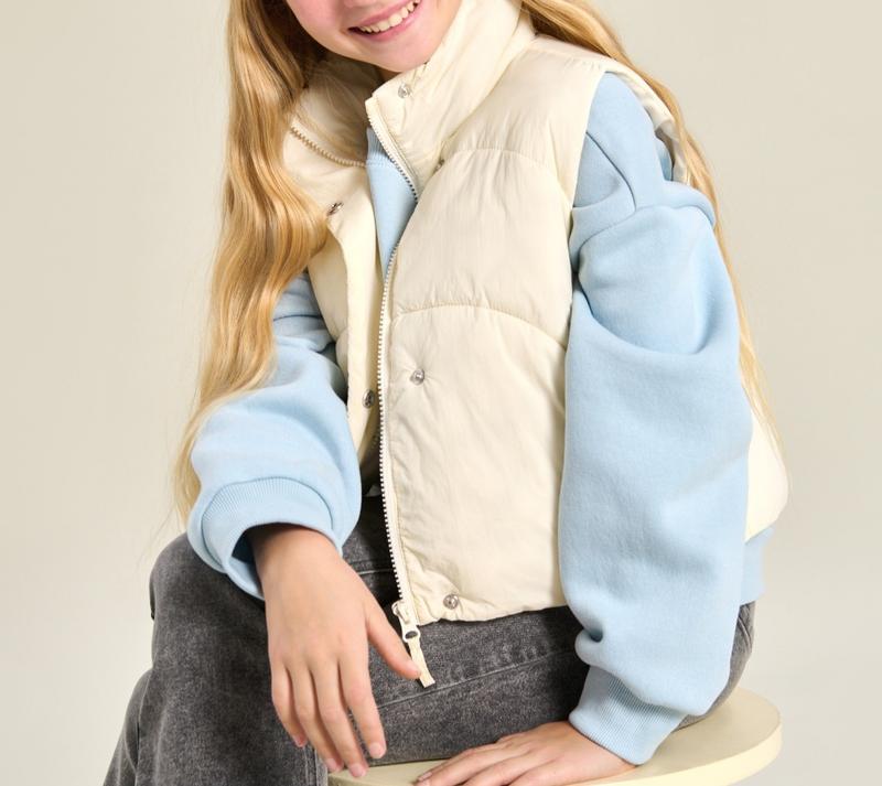 Фірмова укорочена жилетка для дівчинки кремового кольору. Комір стійка, стьобана, застібка блискавка та кнопки. Матеріал: 100% поліамід. Розміри: 140-164 (уточнюйте)