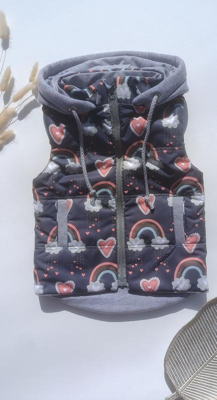 Жилетка дівчача,для дівчаток верх тканина -плащівка ,не промокає, наповнювач- холософт 110гр.підкладка із мікро флісу,дуже приємна і мякенька. Заміри заміряні по спинці 80-пів обхват.грудей 32,довжина.37. 86-об.гр..32, д38. 92-об.гр.33, д39. 98-об.гр.33, д40. 104-об.гр.34, д.45. 110-об.гр.35, д 47 116-об.гр.37, д49. 122-об.гр.39, д.54. 128-об.гр.42, д 57.(+-0.5 см)